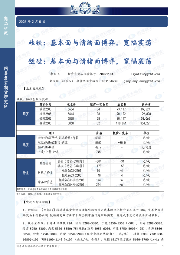 【国泰君安期货】【202602】硅铁:基本面与情绪面博弈,宽幅震荡;锰硅:基本面与情绪面博弈,宽幅震荡-3页