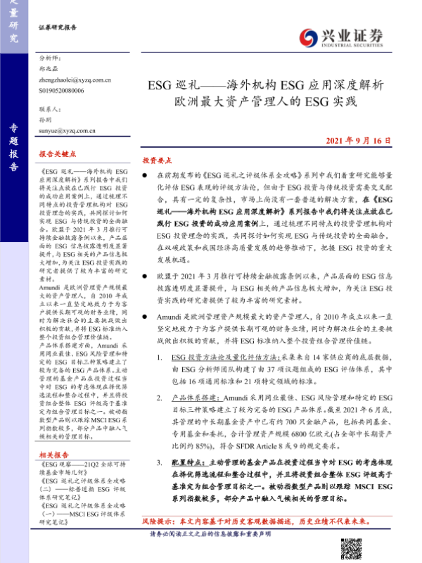 【兴业证券】【20210916】ESG巡礼——海外机构 ESG应用深度解析 欧洲最大资产管理人的 ESG实践-20页