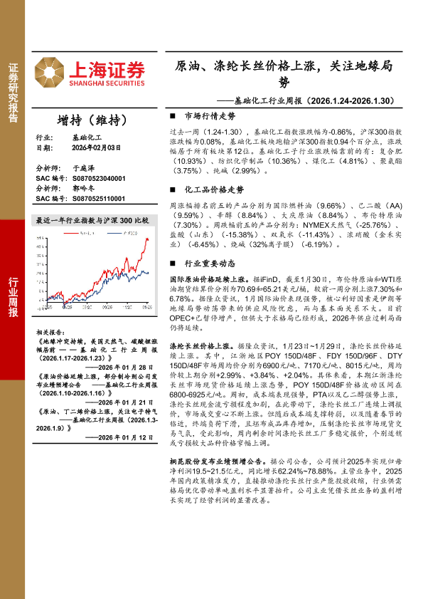 【上海证券】【202602】基础化工行业周报:原油、涤纶长丝价格上涨,关注地缘局势-10页