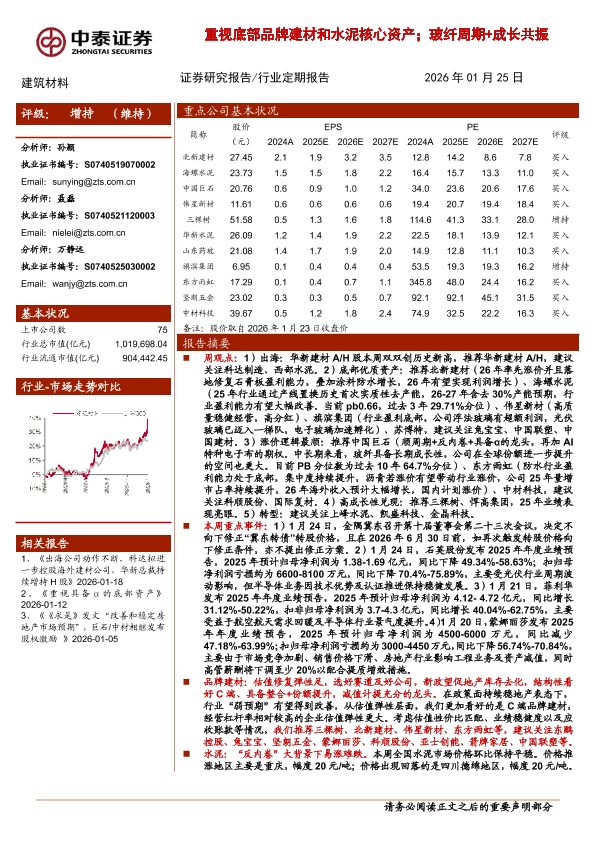 【中泰证券】【202601】建筑材料-重视底部品牌建材和水泥核心资产;玻纤周期+成长共振-260125-20页