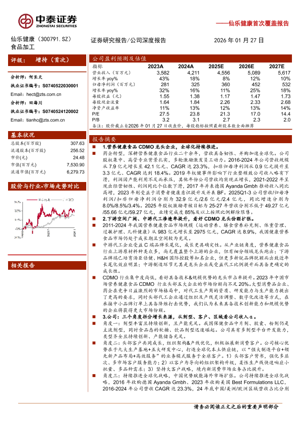 【中泰证券】【202601】仙乐健康(300791)首次覆盖报告:营养健康食品CDMO龙头,全球化战略持续推进-22页