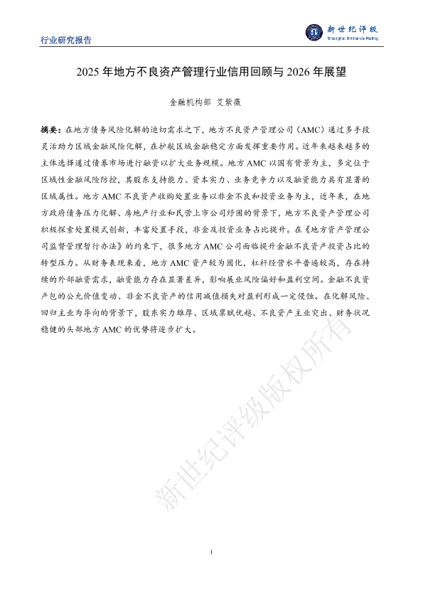 【金融机构部艾紫薇】【2025】2025年地方不良资产管理行业信用回顾与 2026年展望-19页