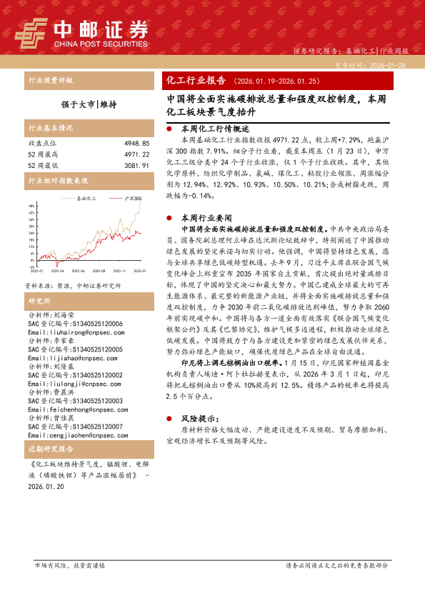 【中邮证券】【202601】化工行业报告:中国将全面实施碳排放总量和强度双控制度,本周化工板块景气度抬升-42页