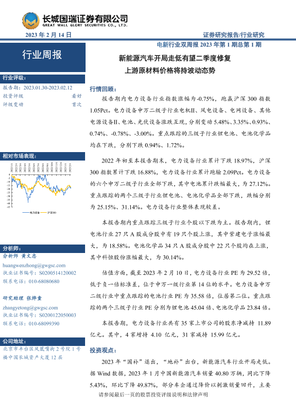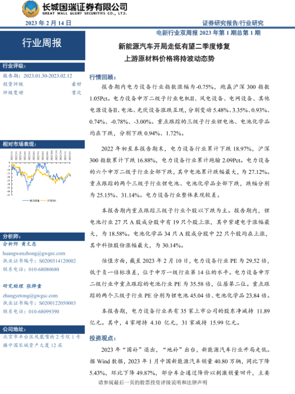 【长城国瑞证券】【20230214】电新行业双周报2023年第1期总第1期:新能源汽车开局走低有望二季度修复 上游原材料价格将持波动态势-18页