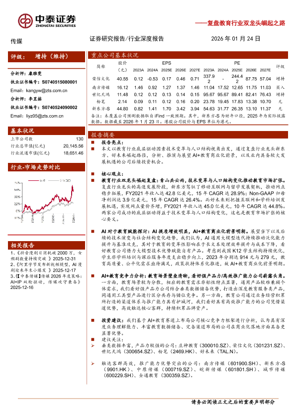 【中泰证券】【202601】复盘教育行业双龙头崛起之路:AI+教育深度报告:技术人口双轮驱动,AI+教育商业破局-34页