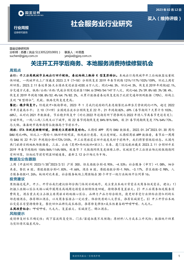 【国金证券】【20230212】社会服务行业周报:关注开工开学后商务、本地服务消费持续修复机会-17页