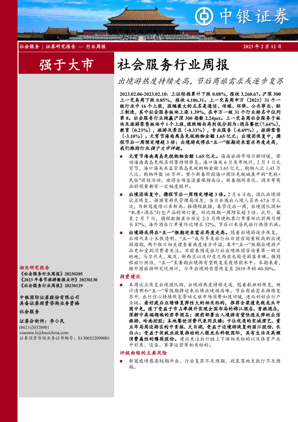 【中银证券】【20230212】社会服务行业周报:出境游热度持续走高,节后商旅需求或逐步复苏-21页