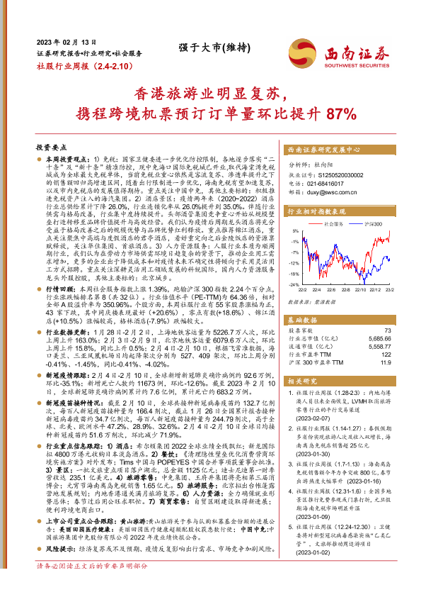 【西南证券】【20230213】社服行业周报:香港旅游业明显复苏,携程跨境机票预订订单量环比提升87%-19页