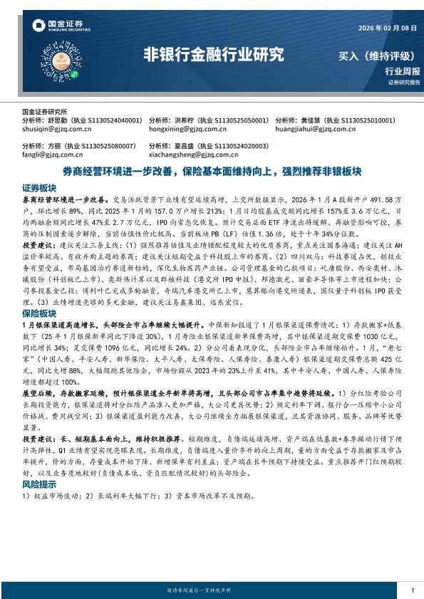 【国金证券】【202602】非银行金融行业周报:券商经营环境进一步改善,保险基本面维持向上,强烈推荐非银板块-9页