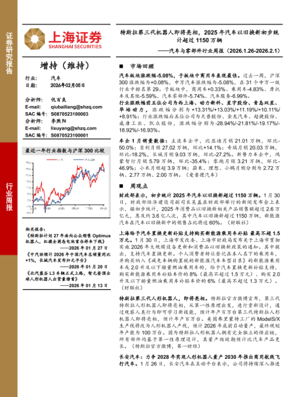 【上海证券】【202602】汽车与零部件行业周报:特斯拉第三代机器人即将亮相,2025年汽车以旧换新初步统计超过1150万辆-3页