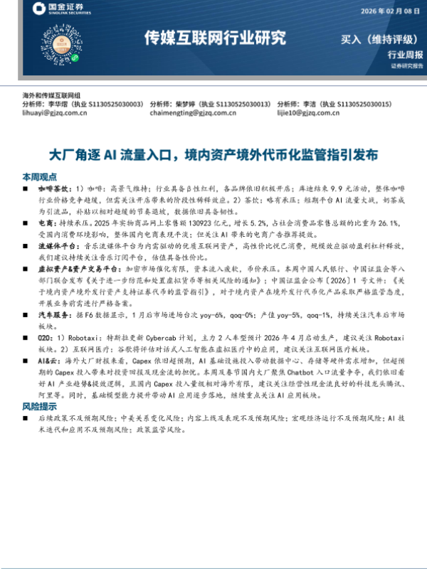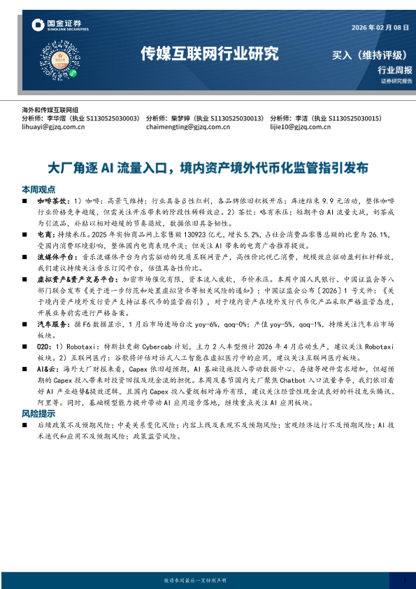 【国金证券】【202602】传媒互联网行业周报:大厂角逐AI流量入口,境内资产境外代币化监管指引发布-12页