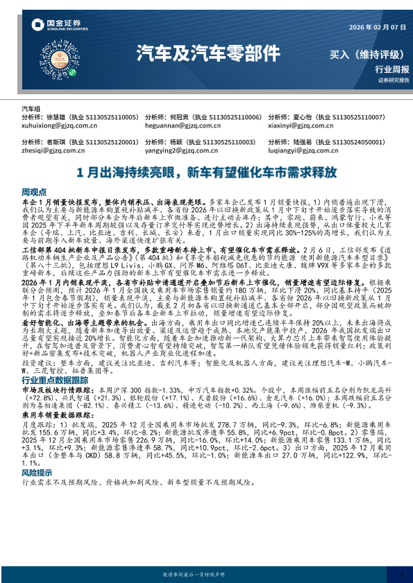 【国金证券】【202602】汽车及汽车零部件行业周报:1月出海持续亮眼,新车有望催化车市需求释放-12页