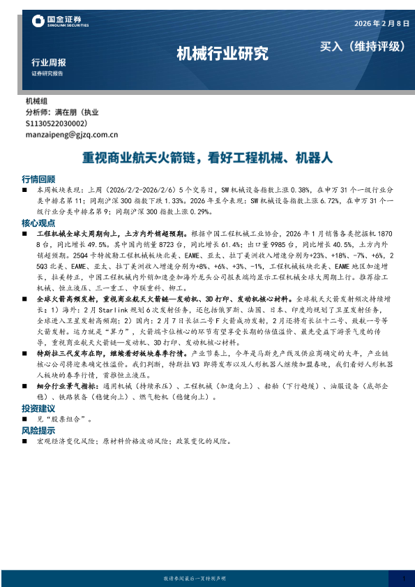 【国金证券】【202602】机械行业研究:重视商业航天火箭链,看好工程机械、机器人-15页