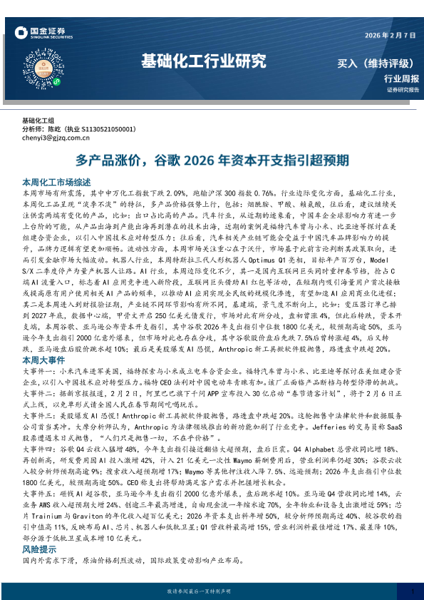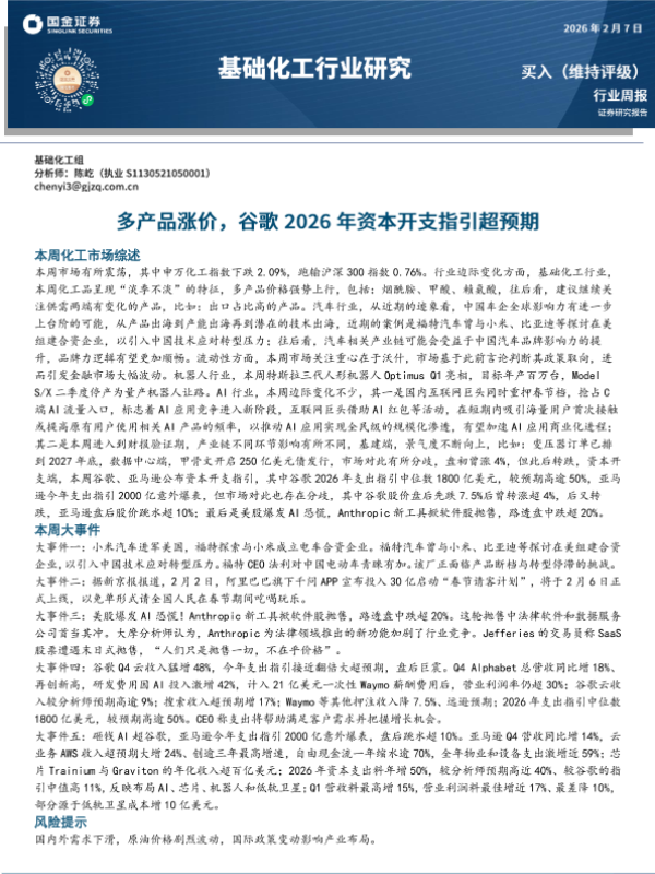 【国金证券】【202602】基础化工行业研究:多产品涨价,谷歌2026年资本开支指引超预期-23页