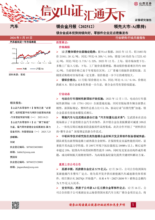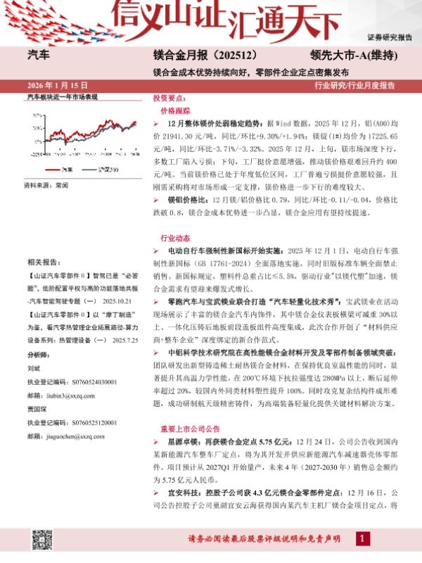 零部件定点 镁合金 新材料 成本优势 汽车轻量化