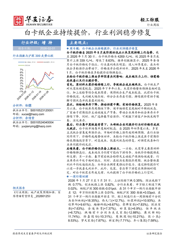【华安证券】【202602】白卡纸企业持续提价,行业利润稳步修复-20页