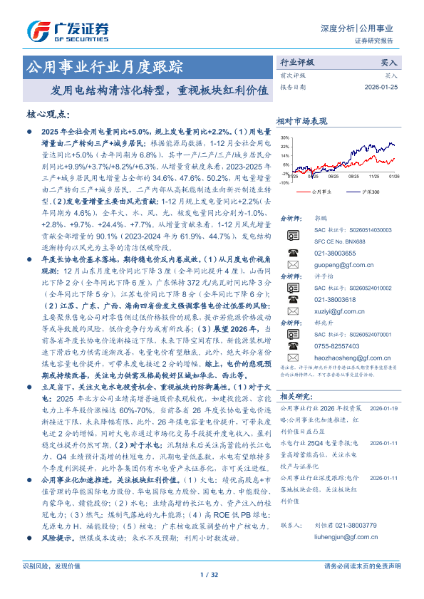 【广发证券】【202601】公用事业行业月度跟踪:发用电结构清洁化转型,重视板块红利价值-32页
