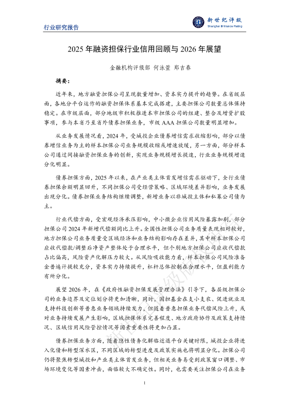 【金融机构评级部何泳萱郑吉春】【2025】2025年融资担保行业信用回顾与 2026年展望-21页