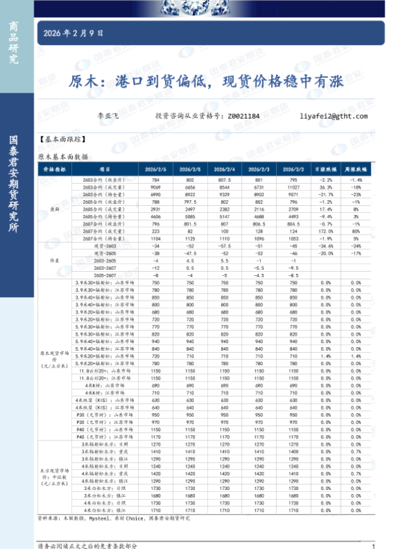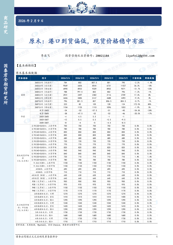 【国泰君安期货】【202602】原木:港口到货偏低,现货价格稳中有涨-3页
