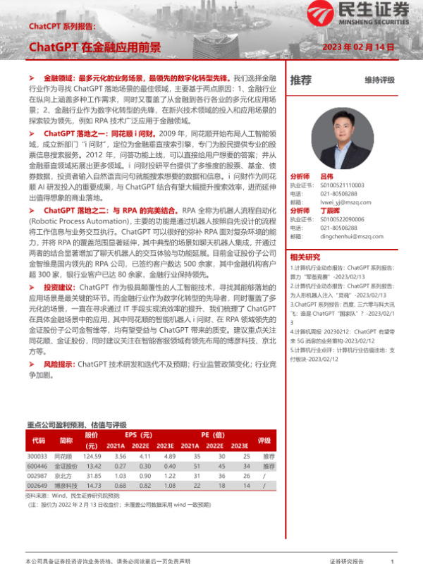 【民生证券】【20230214】计算机:ChatCPT系列报告:ChatGPT在金融应用前景-14页