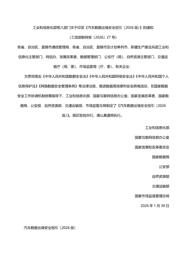 【工业和信息化部&国家互联网信息办公室&国家发展和改革委员会&国家数据局&公安部&自然资源部&交通运输部&国家市场监督管理总局】【2026】汽车数据出境安全指引(2026版)-22页