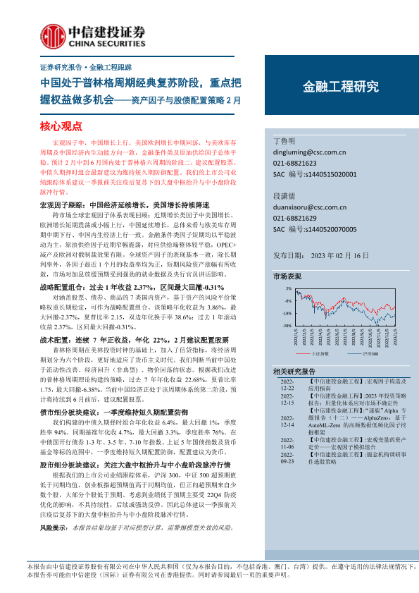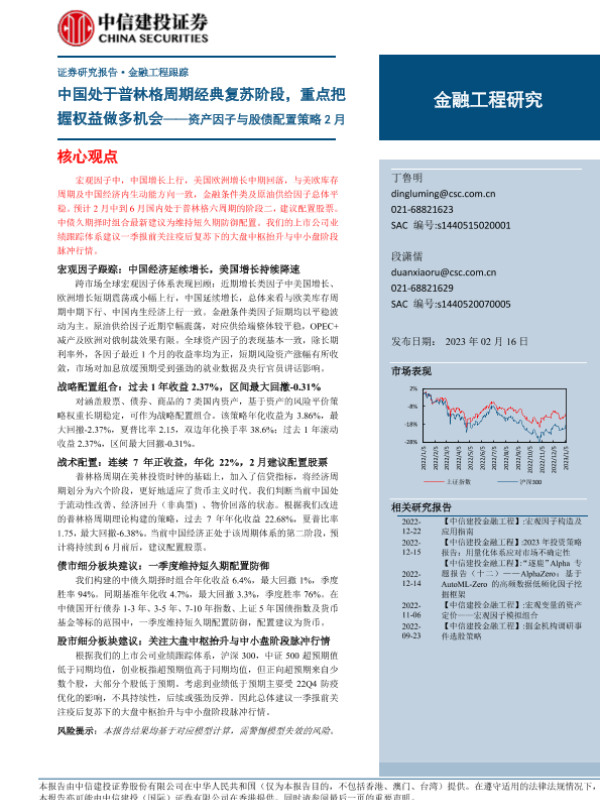 【中信建投证券】【20230216】资产因子与股债配置策略2月:中国处于普林格周期经典复苏阶段,重点把握权益做多机会-20页
