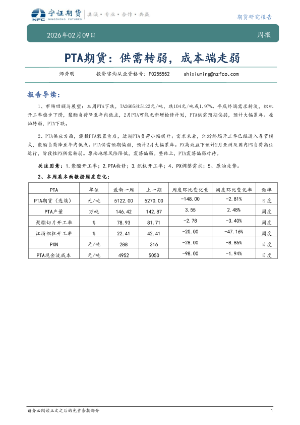 【宁证期货】【202602】PTA期货:供需转弱,成本端走弱-7页