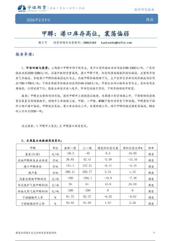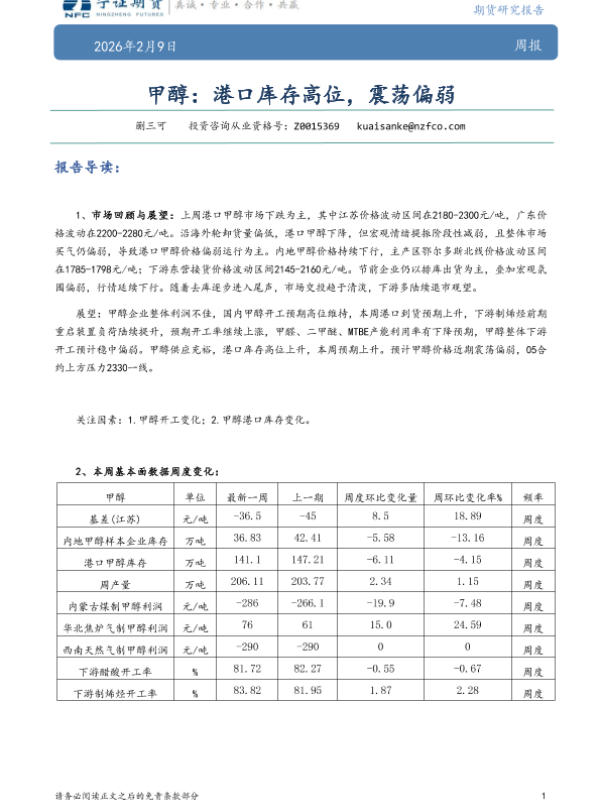 【宁证期货】【202602】甲醇:港口库存高位,震荡偏弱-5页