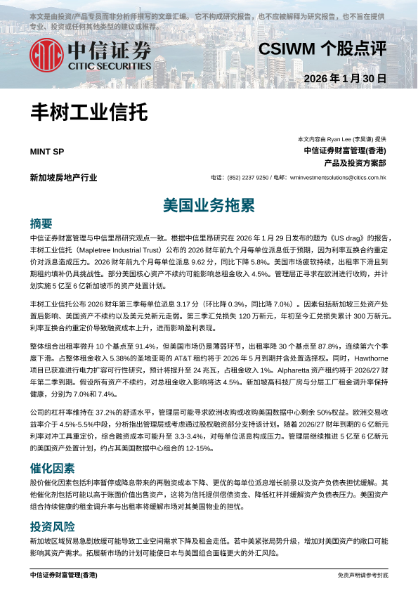 资产处置计划 派息低于预期 欧洲收购 美国市场疲软 丰树工业信托
