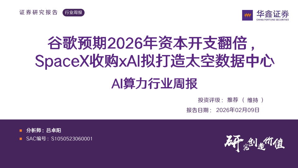 【华鑫证券】【202602】AI算力行业周报(谷歌预期2026年资本开支翻倍,SpaceX收购xAI拟打造太空数据中心)-36页