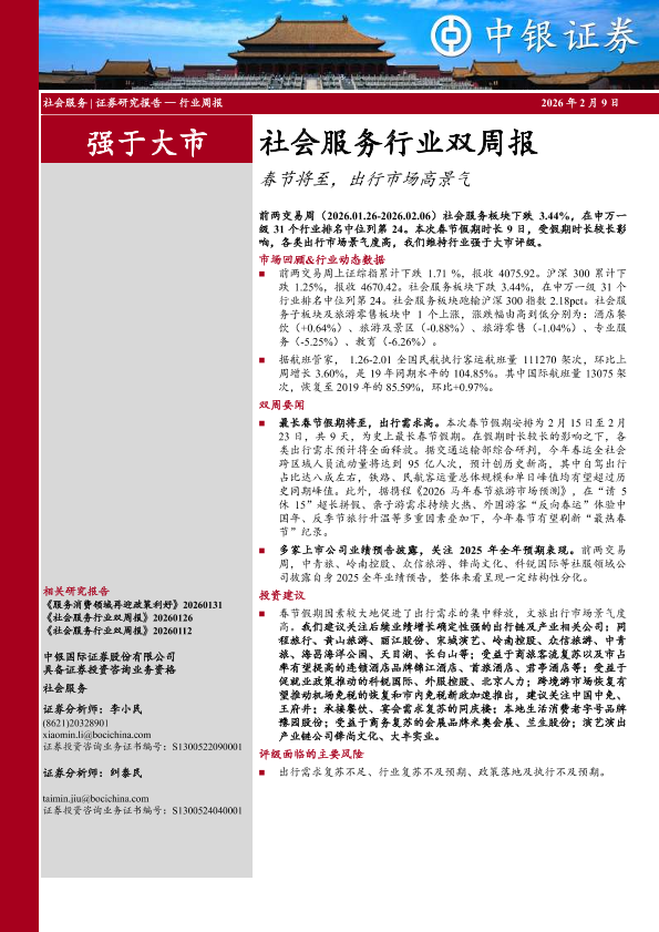 出行市场 酒店餐饮 春节假期 旅游零售 投资建议