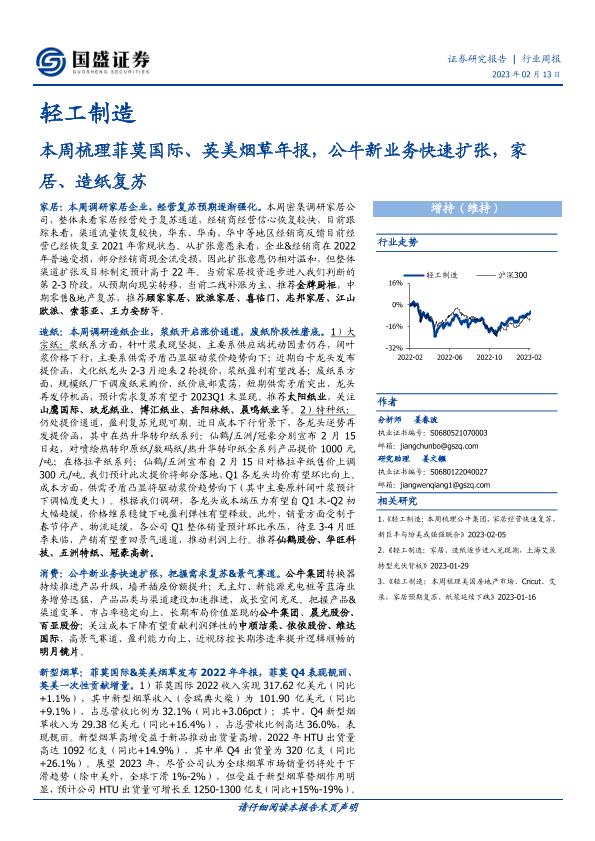 【国盛证券】【20230213】轻工制造行业周报:本周梳理菲莫国际、英美烟草年报,公牛新业务快速扩张,家居、造纸复苏-43页