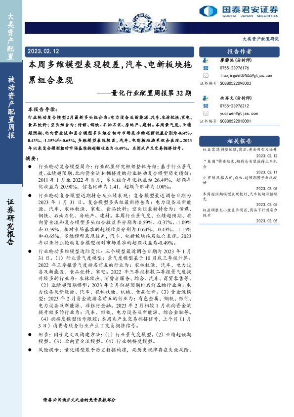 【国泰君安证券】【20230212】量化行业配置周报第32期:本周多维模型表现较差,汽车、电新板块拖累组合表现-15页
