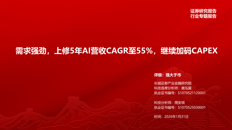 【长城证券】【202601】电子行业:需求强劲,上修5年AI营收CAGR至55%,继续加码CAPEX-30页