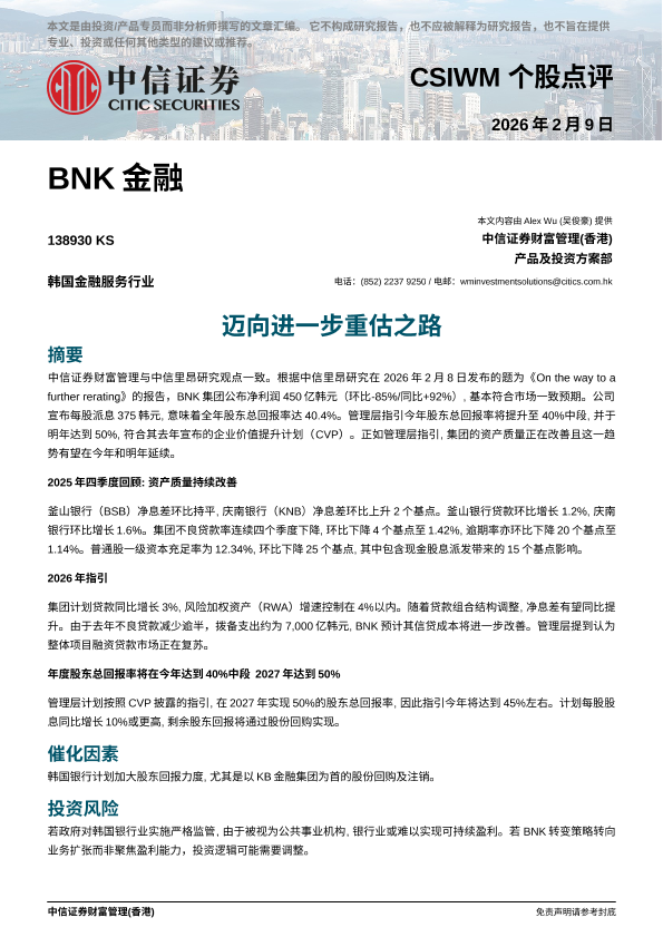 市净率 韩国金融 股东回报 银行股 资产质量改善