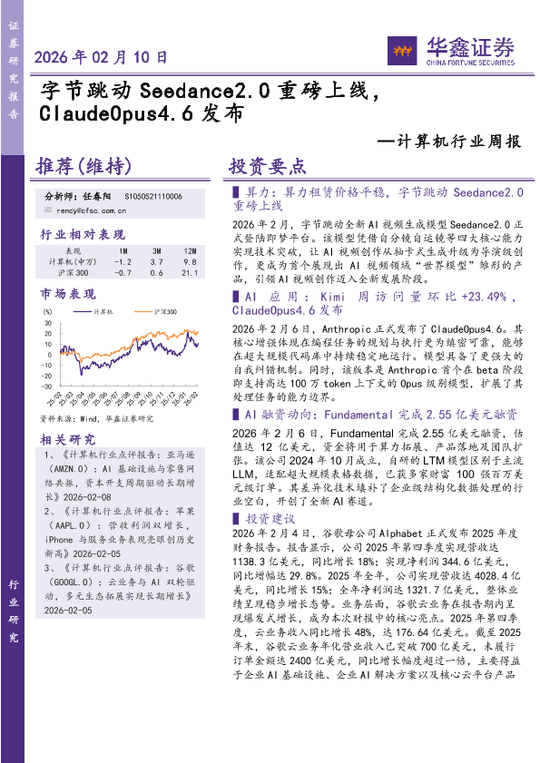 【华鑫证券】【202602】计算机行业周报:字节跳动Seedance2.0重磅上线,ClaudeOpus4.6发布-18页