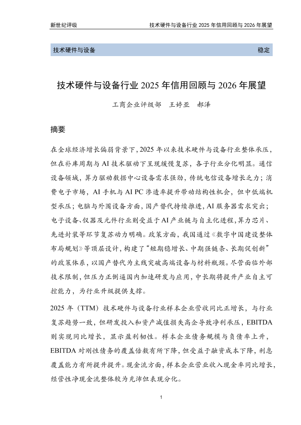 【新世纪评级】【2025】技术硬件与设备行业 2025年信用回顾与 2026年展望-74页