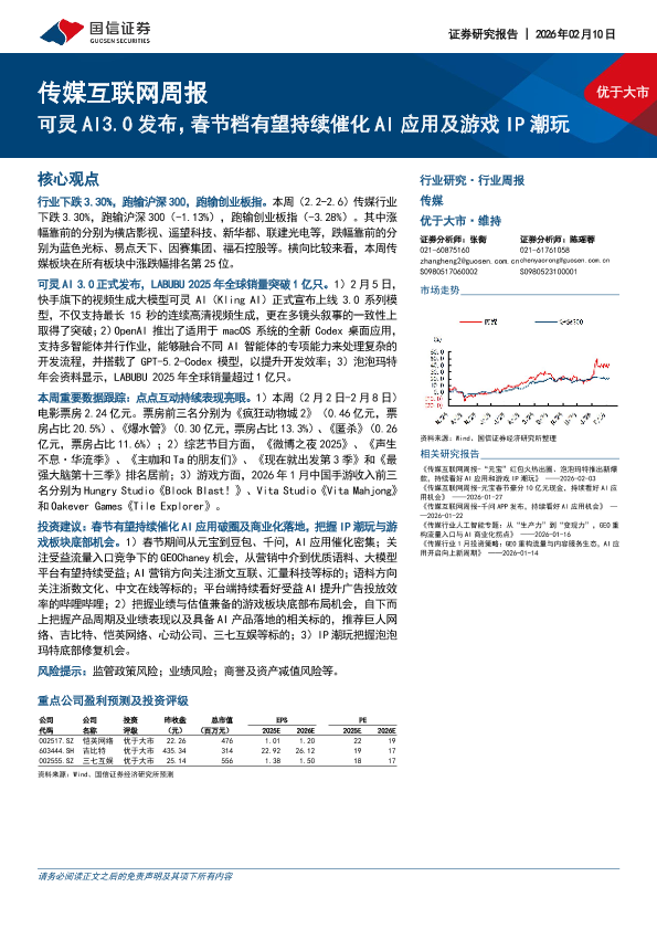 【国信证券】【202602】传媒互联网周报:可灵AI3.0发布,春节档有望持续催化AI应用及游戏IP潮玩-13页