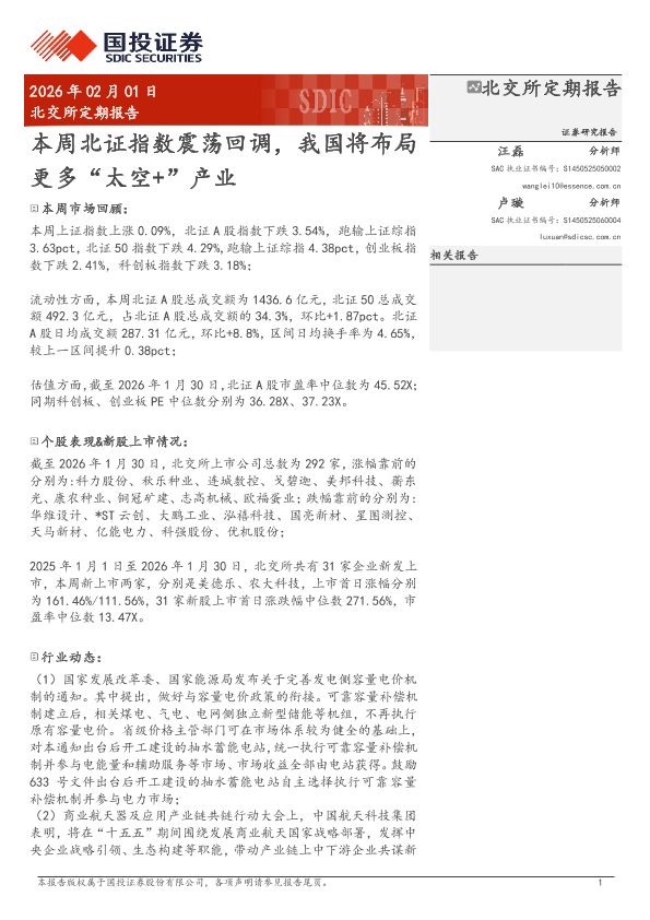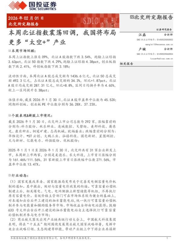 【国投证券】【202602】2026年02月10日更新-【国投证券】北交所定期报告:本周北证指数震荡回调,我国将布局更多“太空+”产业-10页