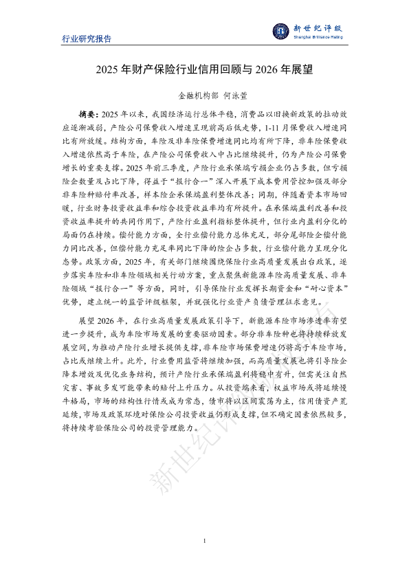 【金融机构部何泳萱】【2025】2025年财产保险行业信用回顾与 2026年展望-20页