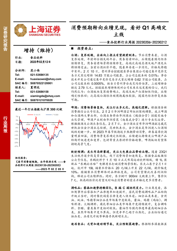 【上海证券】【20230212】食品饮料行业周报:消费预期转向业绩兑现,看好Q1高确定主线-20页