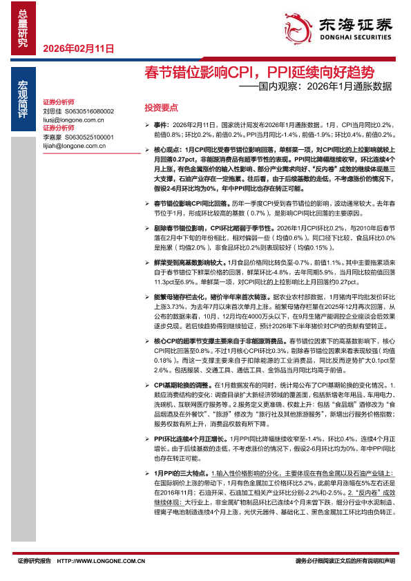 【东海证券】【202602】春节错位影响CPI,PPI延续向好趋势——国内观察:2026年1月通胀数据-6页