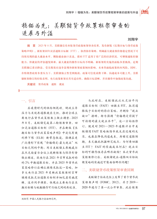 【《金融市场研究》】【202602】稳锚为先:美联储货币政策框架审查的进展与外溢-8页