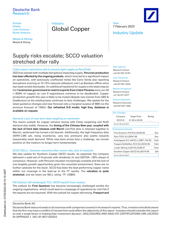 【Deutsche Bank Research】【20230207】Global Copper Supply risks escalate; SCCO valuation stretch-13页