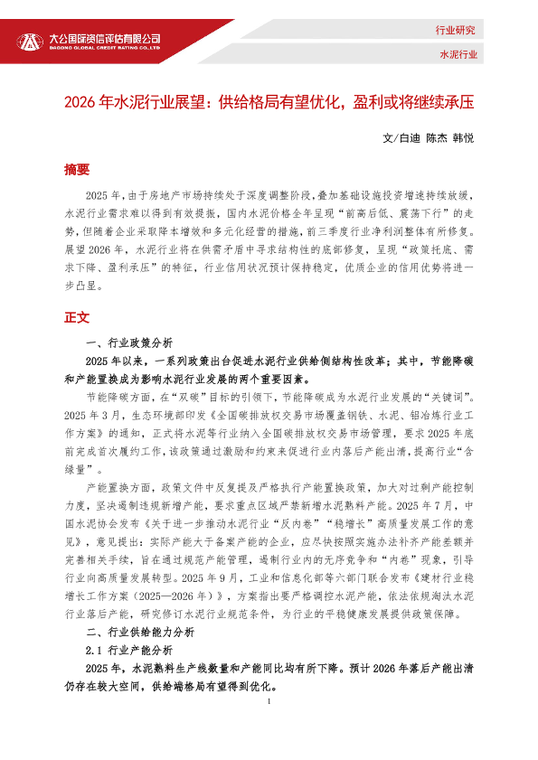【大公国际】【2025】2026年水泥行业展望:供给格局有望优化,盈利或将继续承压-13页