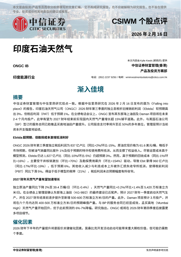 印度石油天然气公司 天然气产量增长 BP合作项目 股息支付率提升 Ebitda超预期
