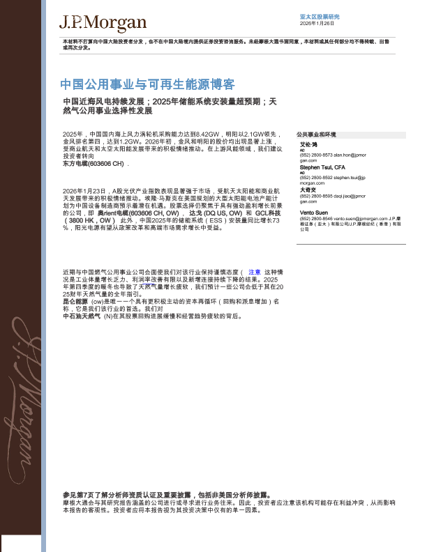 【J.P. Morgan】【202601】中国公用事业与可再生能源博客_中国海上风电持续活跃;2025年储能装机量超预期;精选燃气公用事业股-12页