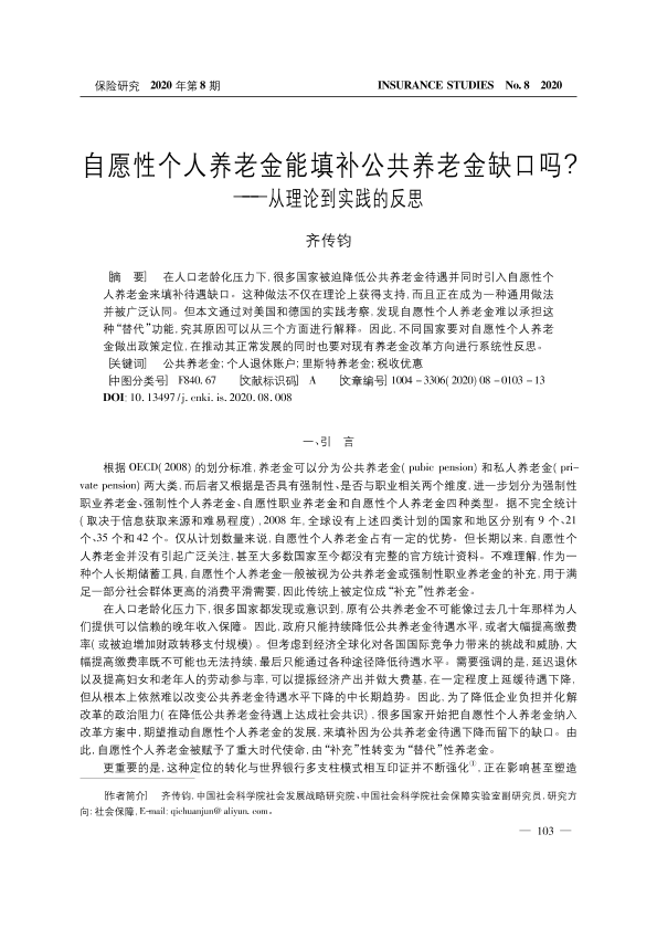 【中国社会科学院】【2020】自愿性个人养老金能填补公共养老金缺口吗?🟥🟥一从理论到实践的反思-13页