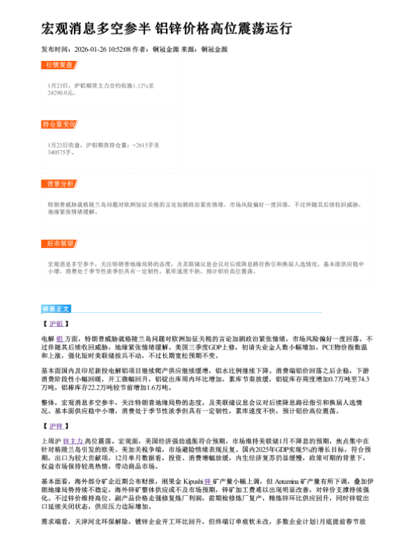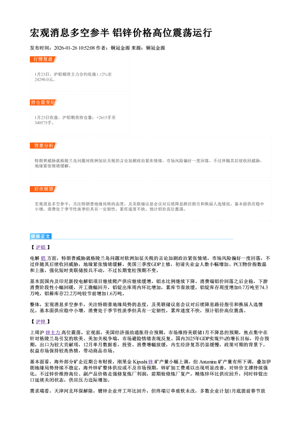 【铜冠金源期货】【202601】宏观消息多空参半 铝锌价格高位震荡运行-2页