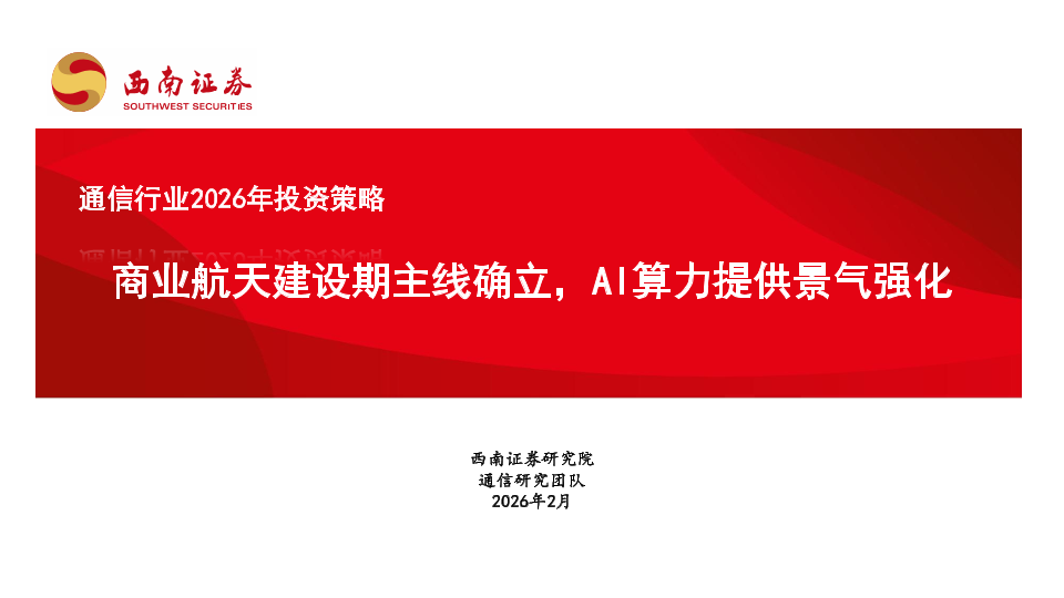 【西南证券】【202602】通信行业2026年投资策略:商业航天建设期主线确立,AI算力提供景气强化-58页
